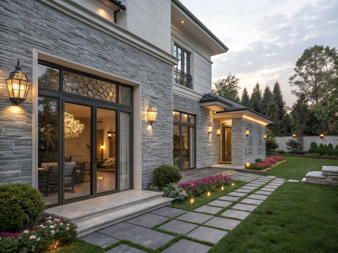 Design and implementation of a lush garden with interlock pathways, decorative plants, and external lighting for a luxury villa.