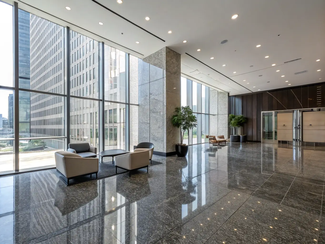 Complete interior renovation including wall tiling, carpentry, and epoxy flooring for a high-end corporate office in Dubai.